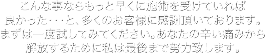 私は、改善を実感していない方からは施術費用はいただきません。「ここなら信用できる、安心して任せられる」と思っていただけたら施術費用をお支払ください。